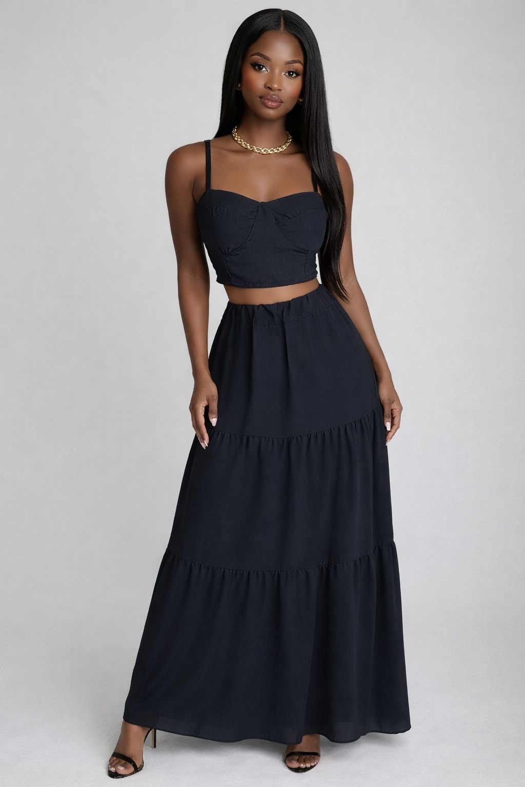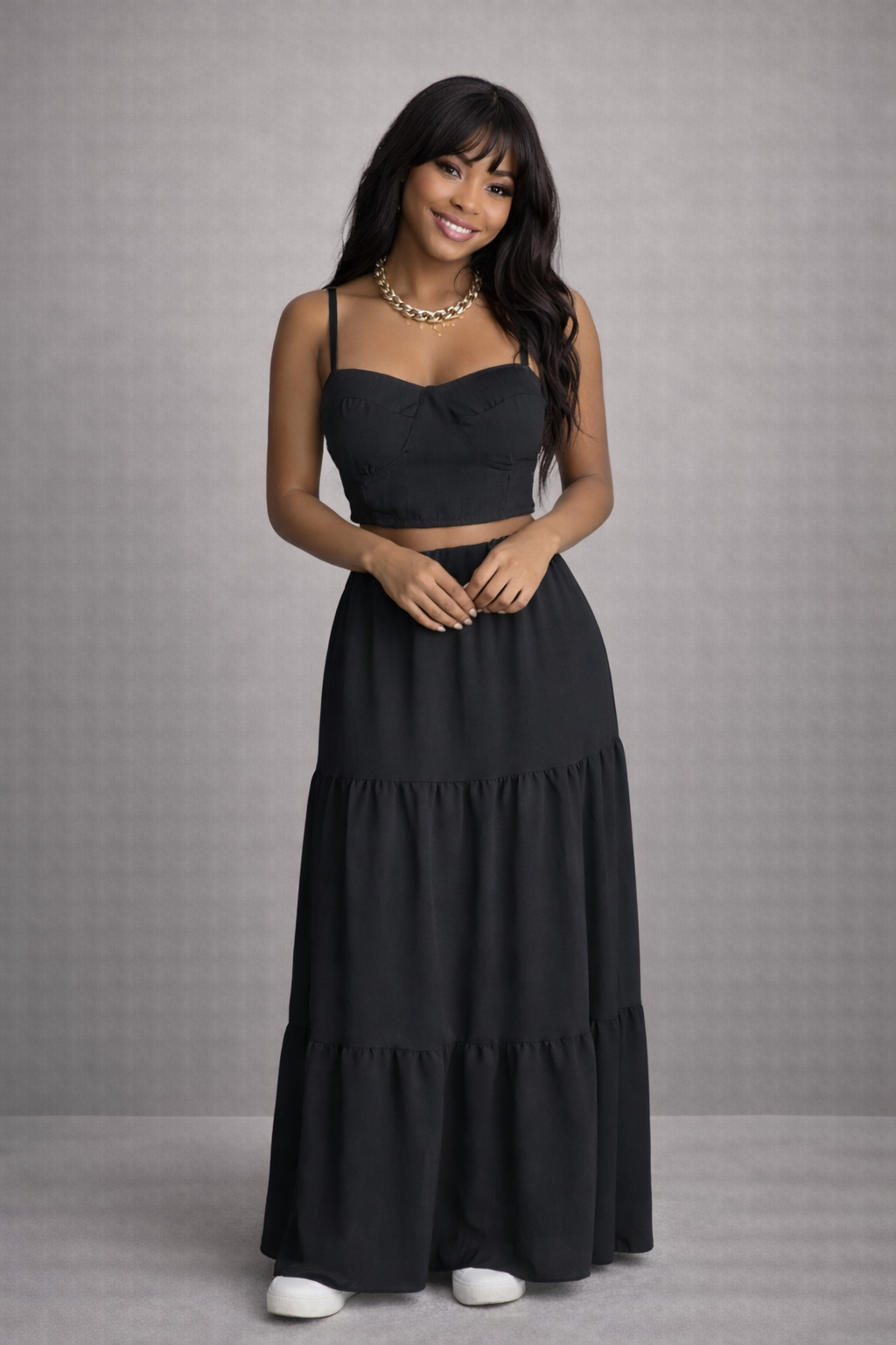 Conjunto elegante e feminino de 2 peças em preto, perfeito para um look sofisticado e versátil. Inclui top cropped com alças ajustáveis e decote coração, e saia longa com camadas em folhos para movimento e estilo.