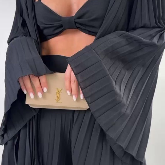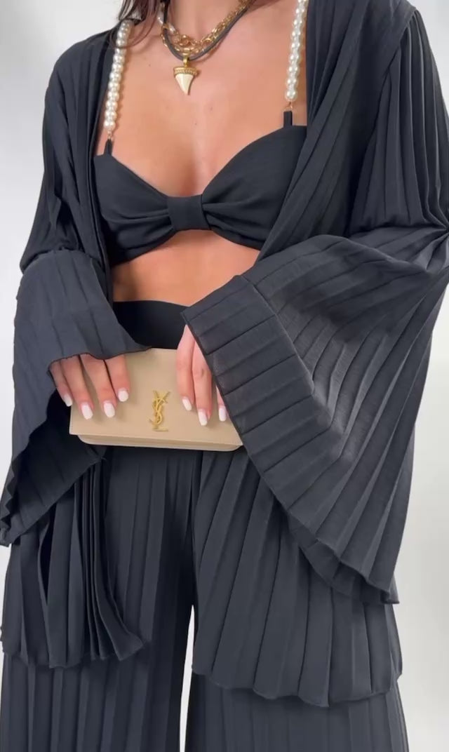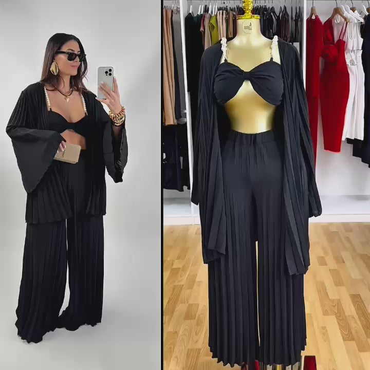 Conjunto composto por calça top e Kimono. A calça é cinta subida, pantalona e tem elástico na cintura atrás. O top tem alças em pérolas, tecido duplo no peito e elástico nas costas. O Kimono tem manga flare e é plissado.