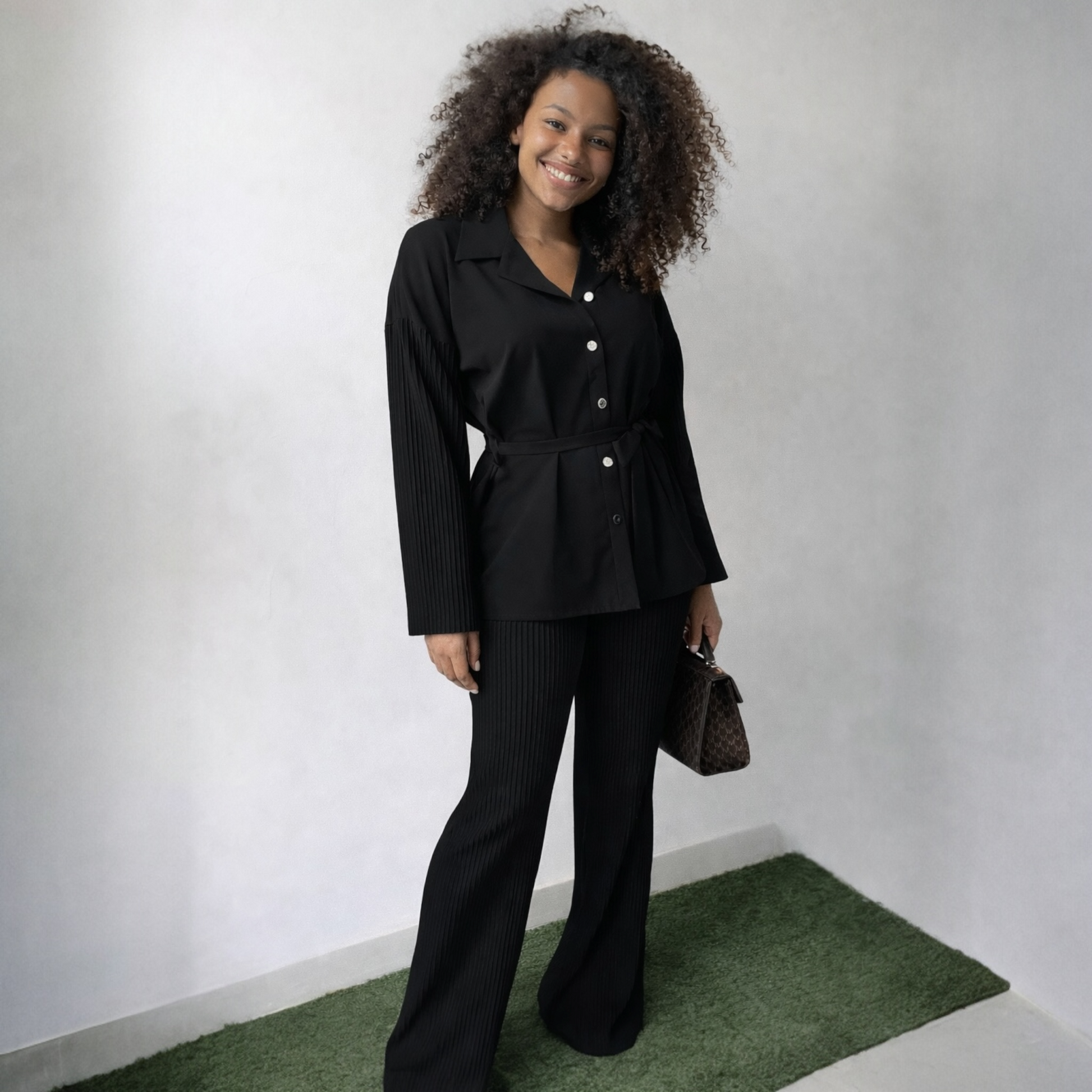 Elegante conjunto plissado de fabrico italiano, composto por casaco com cinto e calças de corte largo. Apresenta detalhes plissados sofisticados nas mangas e pernas, botões frontais e cinto ajustável na cintura. Perfeito para ocasiões especiais ou para um look profissional com estilo.