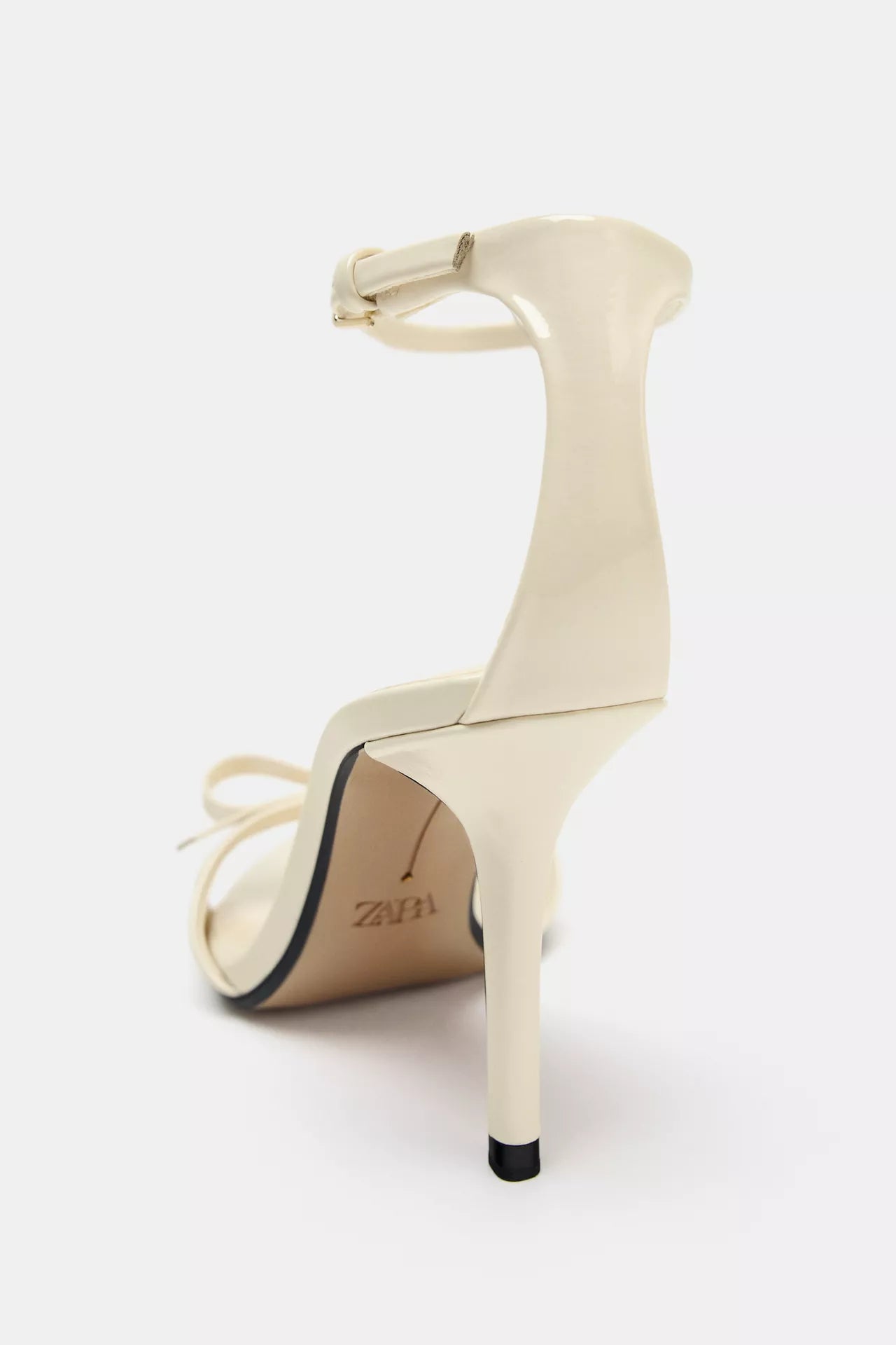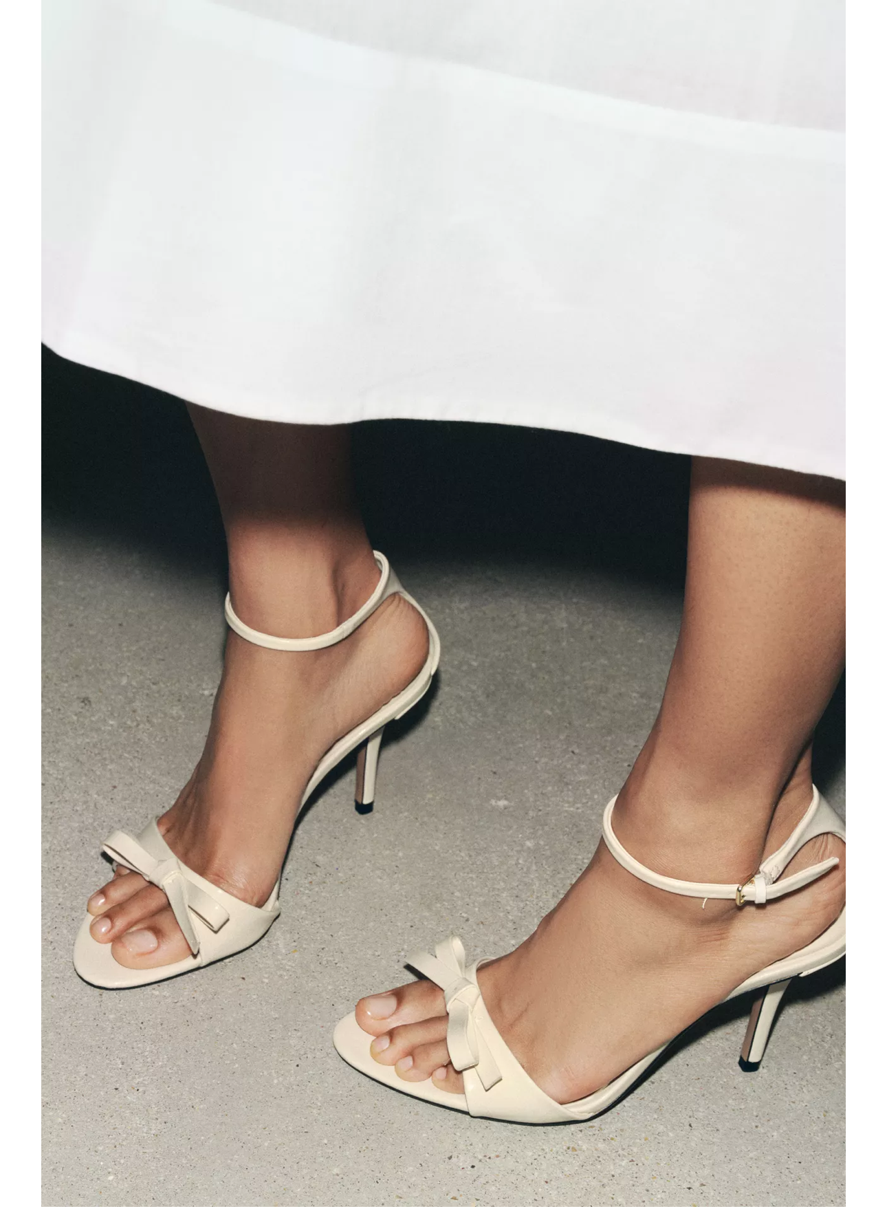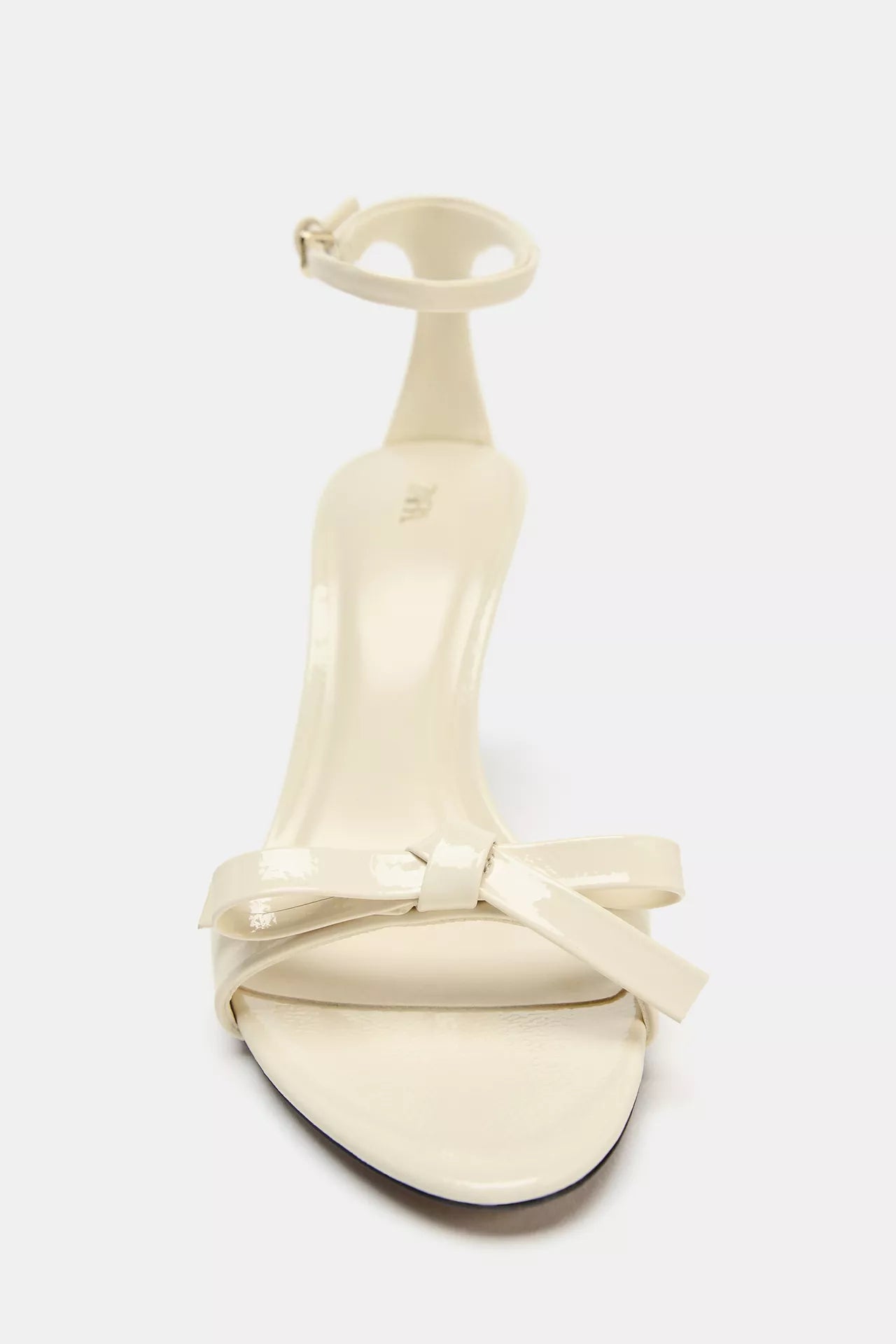 Tira dianteira com detalhe de maxi laço. Tacão alto fino. Fecho mediante tira com fivela na pulseira do tornozo
