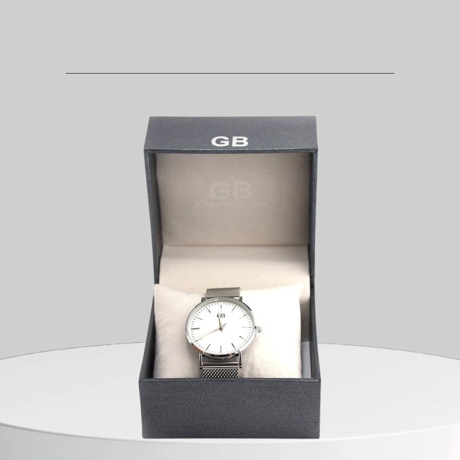 Relógio analógico elegante com caixa prateada e mostrador branco minimalista. Bracelete em malha metálica prateada ajustável. Design clássico e atemporal da marca GB, perfeito para qualquer ocasião.
